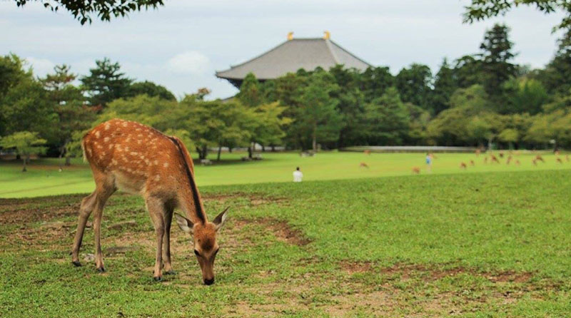 奈良市は本州の中西部にある奈良県の県庁所在地です。平城京として栄えた 8 世紀までさかのぼる有名な寺院や芸術作品があります。東大寺がある奈良公園では鹿が自由に歩いています。東大寺の木造の大仏殿には、「奈良の大仏」として知られる像高 15 m の大仏が安置されています。