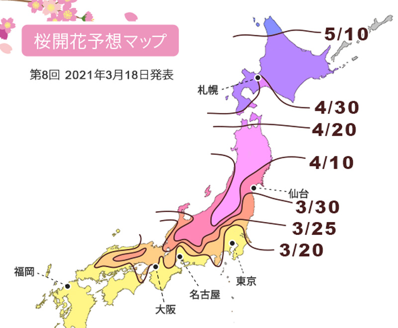 日本気象株式会社は、3月18日に2021年第8回桜の開花・満開予想を発表しました。 北海道から鹿児島までの全国約1,000か所のソメイヨシノについて、今年の開花・満開予想を行っています。